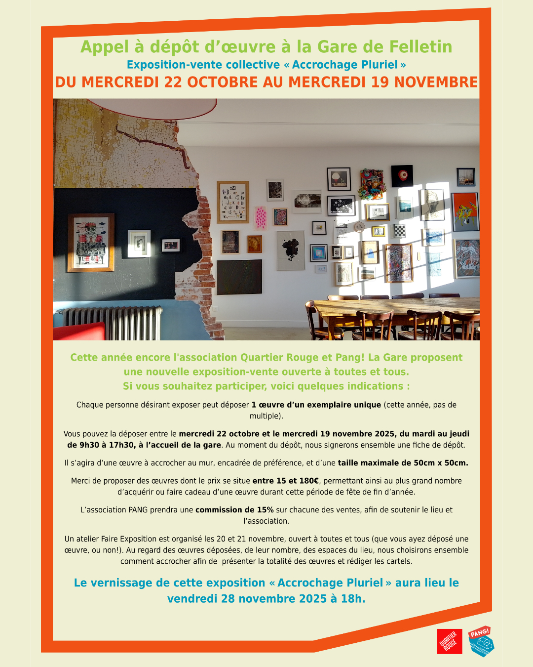 Troisième édition de l'exposition-vente "Accrochage Pluriel" avec Quartier Rouge : venez nous déposer une œuvre de votre choix jusqu'au 20 novembre.